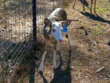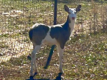 I’m Sir Wallace, commonly known as Walt, a piebald buck named in honor of the father of Stacey, the co-founder. I hope to grow into a wise and patient buck.